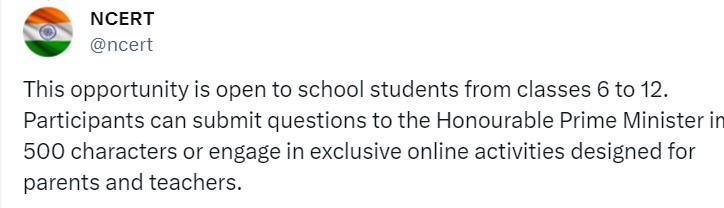The National Council of Educational Research and Training (NCERT) further said, “This opportunity is open to school students from classes 6 to 12. Participants can submit questions to the Honourable Prime Minister in 500 characters or engage in exclusive online activities designed for parents and teachers.”