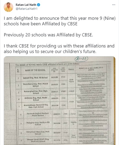 Tripura: State education minister Ratan Lal Nath informed via tweet that nine more schools in Tripura have been affiliated to the Central Board of Secondary Education (CBSE). Earlier, the count CBSE affiliated schools in the state were 20.