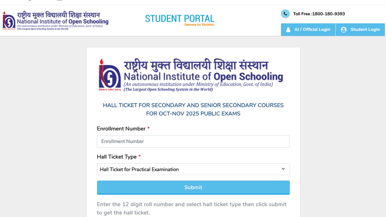 The National Institute of Open Schooling (NIOS) released the NIOS hall ticket 2025 for October session theory exams on Oct 8, 2025 on the official website. The students can download the NIOS admit card 2025 from the official website - sdmis.nios.ac.in.