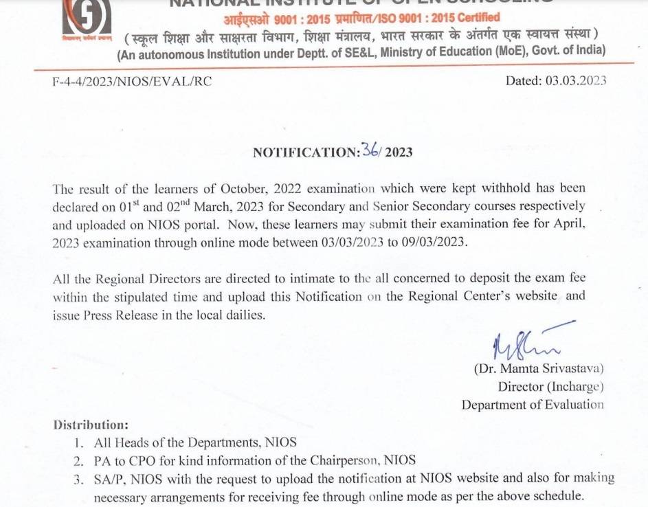 NIOS Results 2023 declared at nios.ac.in. Last date to submit exam fee is March 9.