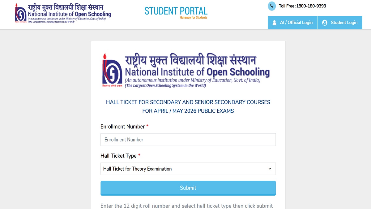NIOS Admit Card 2026: National Institute of Open Schooling has released NIOS hall tickets for April-May 2026 theory exams. Students enrolled in Secondary and Senior Secondary can download their NIOS admit cards online at nios.ac.in. They have to use their enrollment number and hall ticket type to download NIOS admit card for theory exams.