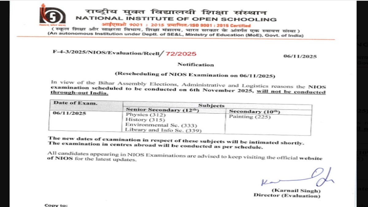 NIOS was scheduled to conduct Physics, History, Environmental Science and Library and Info Sc. Exam for Class 12 and Painting for Class 10 today, which has been cancelled due to first phase of Bihar Assembly Elections 2025.