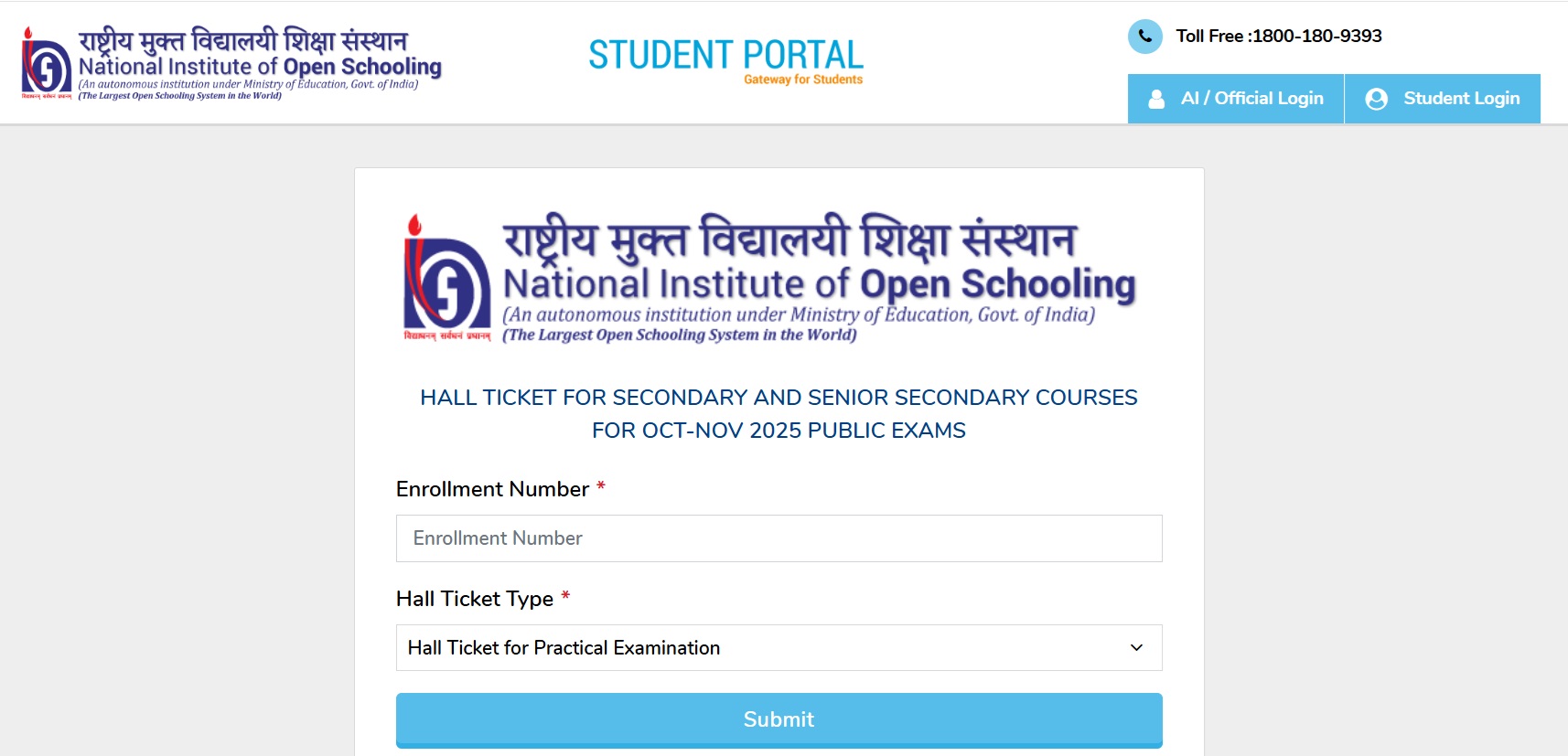 To download the NIOS Hall Ticket 2025 October Exams online, the students need to enter their exam enrollment number.