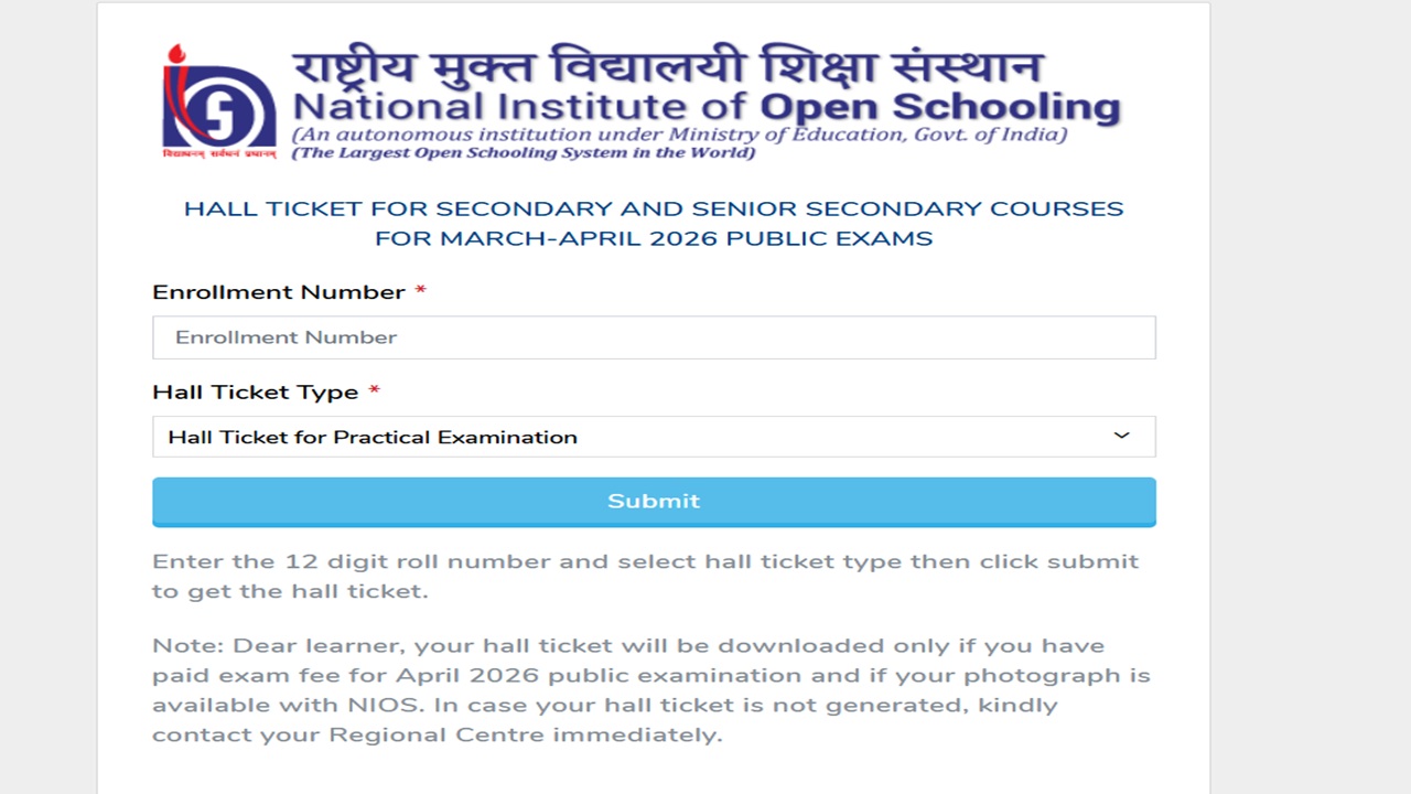 NIOS will conduct the practical exams from March 17 to April 1, 2026. Note that students will be able to download the NIOS admit card 2026 only if they have paid exam fee for April/May 2026 public examination and their photograph is available with NIOS. In case the NIOS hall ticket 2026 is not generated, contact the Regional Centre immediately.