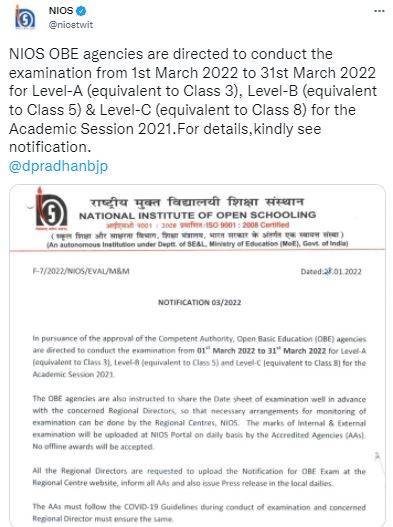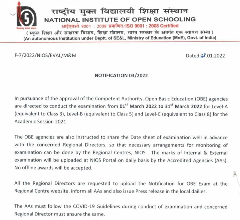 NIOS OBE agencies have been directed to conduct the examination from March 1, 2022, to March 31, 2022, for Level-A (equivalent to Class 3), Level-B (equivalent to Class 5) & Level-C (equivalent to Class 8) for the Academic Session 2021. The official notice released by the authorities reads, “In pursuance of the approval of the Competent Authority, Open Basic Education (OBE) agencies are directed to conduct the examination from 01" March 2022 to 31" March 2022 for level-A (equivalent to Class 3), Level-8 (equivalent to Class 5) and Level-C (equivalent to Class 8) for the Academic Session 2021.”