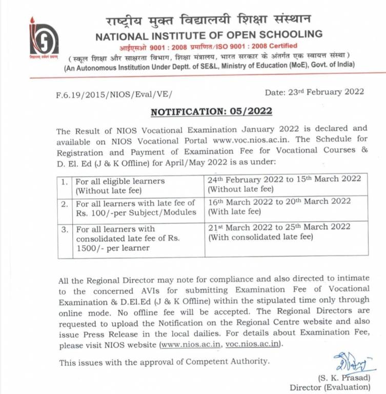 NIOS Vocational Exams Results 2022: The National Institute of Open Schooling has released the NIOS vocational examination January 2022 results. The results are available on the NIOS vocational portal at voc.nios.ac.in. Students must note that the Board has also released the schedule for registration and payment of the examination fee for vocational courses and DElEd J-K offline examination for April-May 2022. The official notification informed that the fee can only be deposited in online mode.