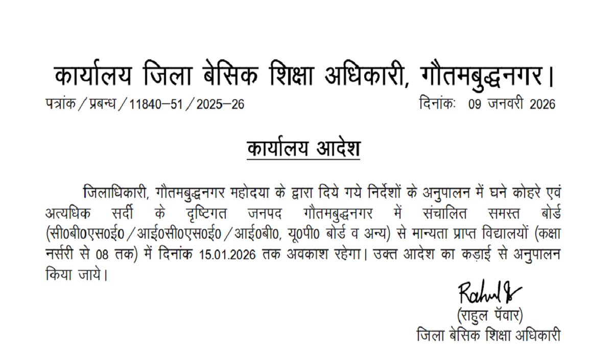 School Closing Update: Due to severe cold wave conditions and dense fog across Noida, District Administration has ordered to close schools from nursery to class 8th for safety and well being of students. As per instructions by District Magistrate, Gautam Buddha Nagar, all schools in Noida will be closed until January 15, 2026. The order applies to educational institutions affiliated with CBSE, ICSE, IB, Uttar Pradesh Board and all other recognised boards.