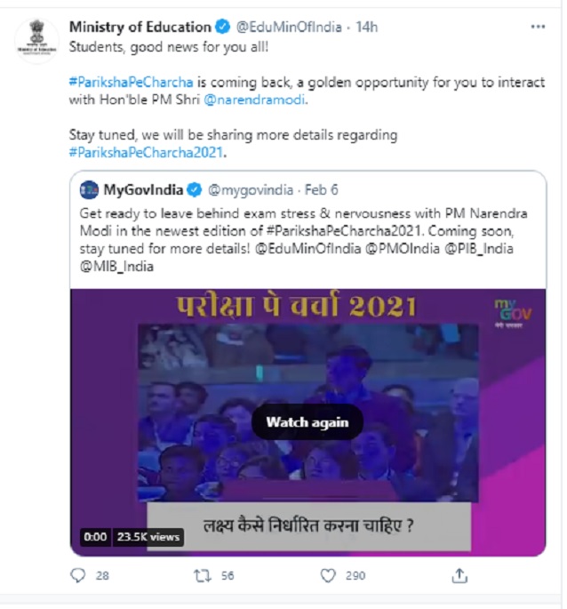 “Pariksha Pe Charcha is coming back, a golden opportunity for you to interact with prime minister Narendra Modi. Stay tuned we will be sharing more details regarding Pariksha pe Charcha 2021,” the Union Ministry of Education said on its official Twitter handle.
