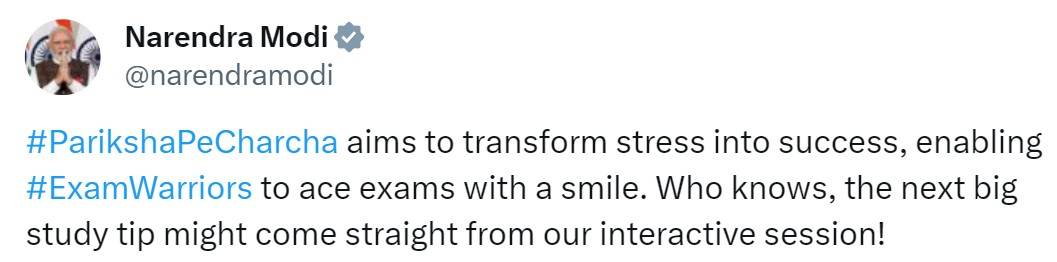 Pariksha Pe Charcha is an interactive session conducted by MoE where the Prime Minister interacts with the exam warriors, share tips and tricks to score well, he also share motivating stories to help students deal with the situation during their lows. In a latest post shared on the official handle of X (previously known as Twitter), Prime Minsiter Narendra Modi said, “#ParikshaPeCharcha aims to transform stress into success, enabling #ExamWarriors to ace exams with a smile. Who knows, the next big study tip might come straight from our interactive session!”