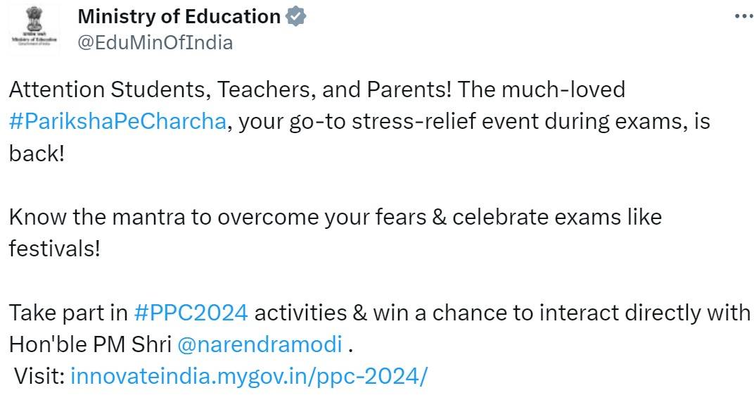 Inviting students, teachers and parents, the Ministry of Education said, "Attention Students, Teachers, and Parents! The much-loved #ParikshaPeCharcha, your go-to stress-relief event during exams, is back! Know the mantra to overcome your fears & celebrate exams like festivals! Take part in #PPC2024 activities & win a chance to interact directly with Hon'ble PM Shri Narendra Modi, Visit: https://innovateindia.mygov.in/ppc-2024/"