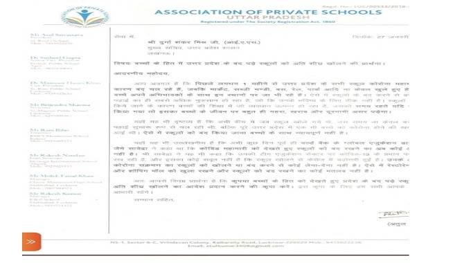 “So we request you to issue an order regarding reopening of schools across the state,” reads the letter from UP private schools association.