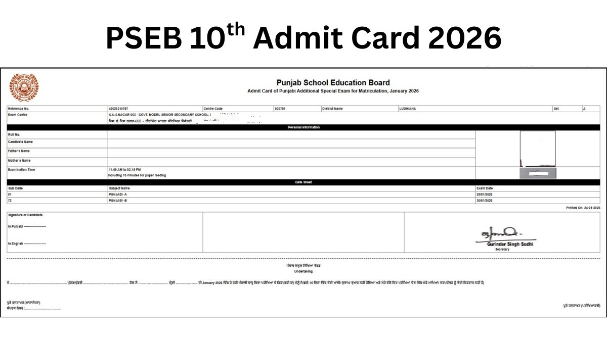 Punjab School Education Board (PSEB) has released PSEB 10th Admit Card 2026. Schools and private candidates can download Punjab Board class 10th admit card 2026 online. The PSEB Class 10th Exam date 2026 will start from March 6, 2026. Students must get their admit card of Punjab Board 10th exam 2026 and keep it safe.