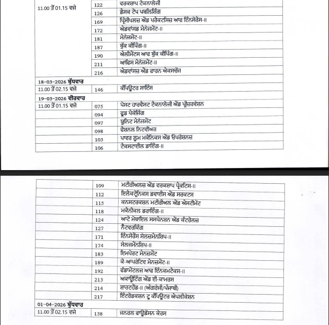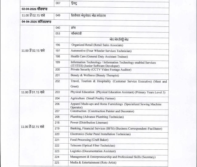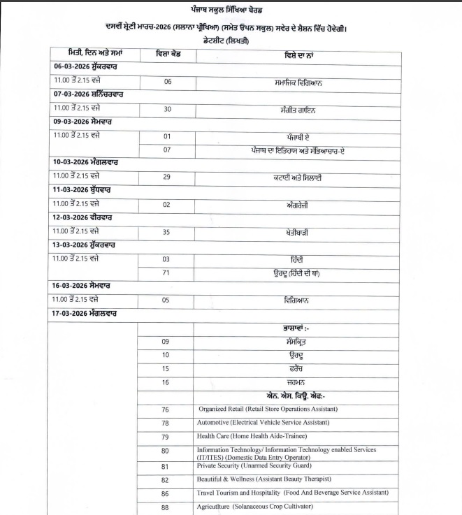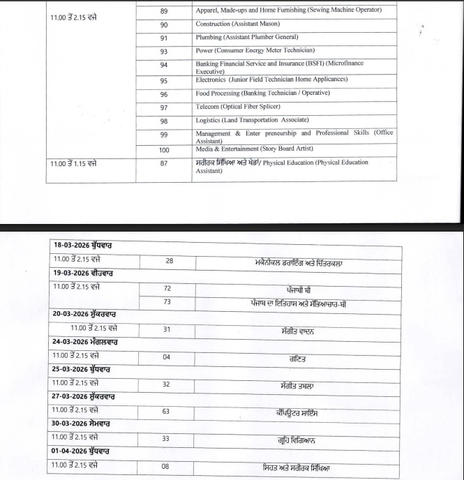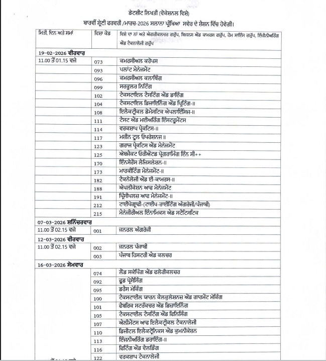 PSEB 12th Date Sheet 2026 for Vocational Subjects