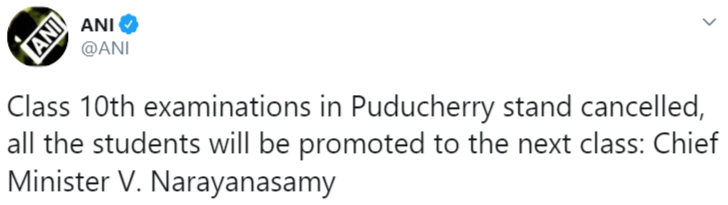 Amid the increasing positive COVID-19 cases, the education department of various states are taking the decision to cancel board exams 2020 in order to keep students and staff member safe from the contagious novel coronavirus. According to the latest tweet published by ANI, “Class 10th examinations in Puducherry stand canceled, all the students will be promoted to the next class: Chief Minister V. Narayanasamy.”