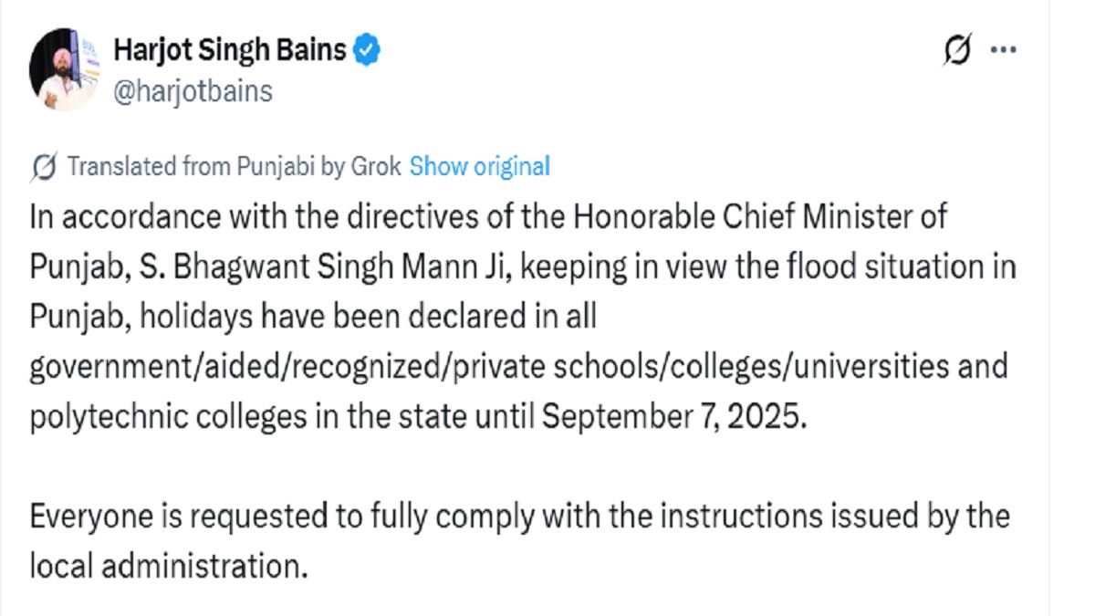 “In accordance with directives of Chief Minister of Punjab, S. Bhagwant Singh Mann, keeping in view flood situation in Punjab, holidays have been declared in all government/aided/recognized/private schools/colleges/universities and polytechnic colleges in state until September 7, 2025. Everyone is requested to fully comply with the instructions issued by the local administration,” Bains wrote on X (formerly Twitter).