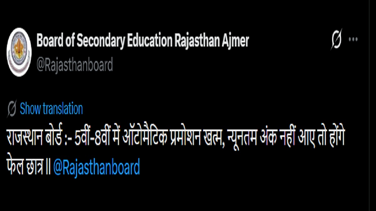 RBSE Promotion Policy: Board of Secondary Education, Rajasthan, Ajmer has tweeted that it has discontinued automatic promotion policy for RBSE class 5 and 8 students. Under revised policy, Rajasthan Board class 5th and 8th students will now be required to obtain minimum qualifying marks to be promoted to next class. Those who fail to meet specified criteria will be declared failed.