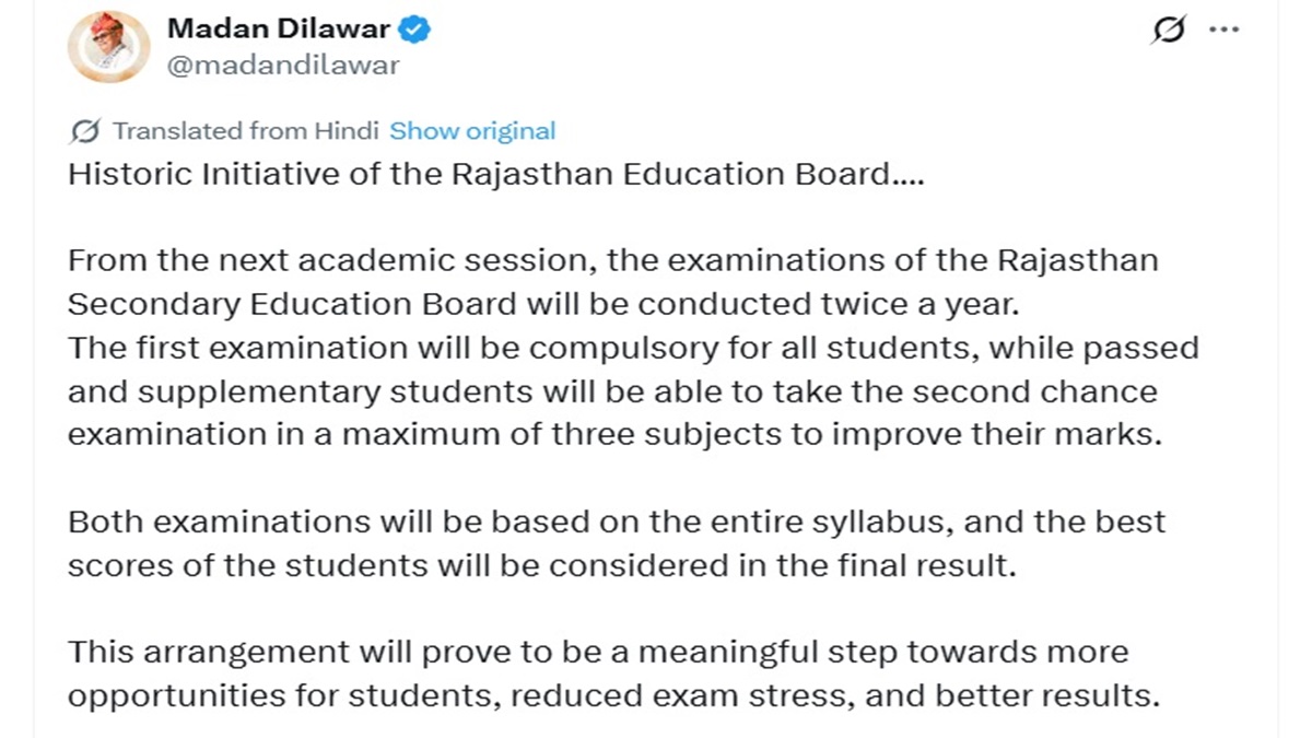 In a post on X (formerly Twitter), education minister described the initiative as a historic step for school education reform in the state. He wrote, “From the next academic session, the examinations of the Rajasthan Secondary Education Board will be conducted twice a year."