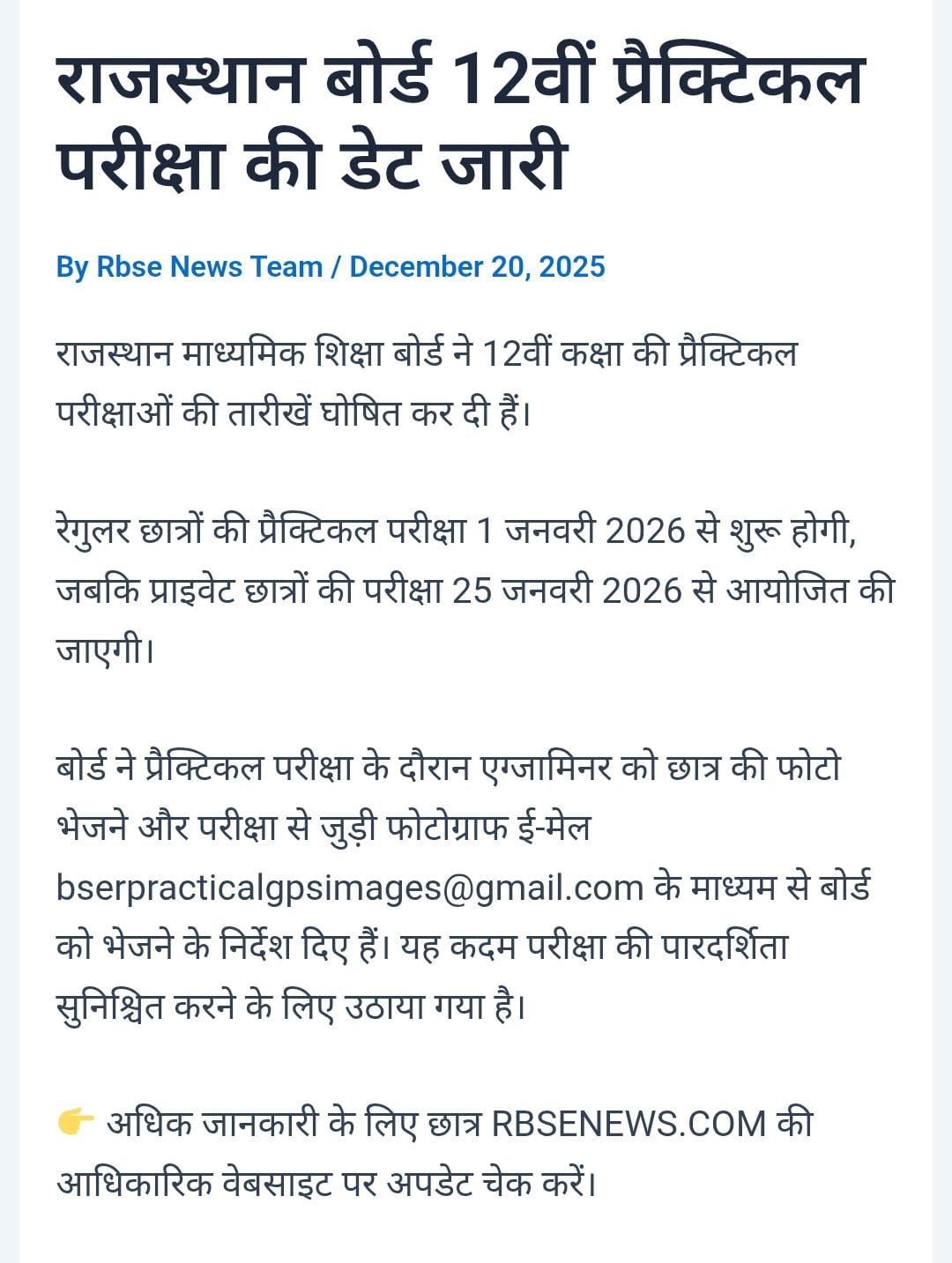 Rajasthan Board RBSE Class 12 Practical Exam Dates 2026 Announced! The Board of Secondary Education, Rajasthan, Ajmer, released the RBSE Class 12 Practical Exam Dates 2026 on the official website. The RBSE Class 12 practical exams for regular students will begin from January 1, 2026, while the practical examinations for private students will be conducted from January 25, 2026.