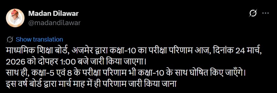 Minister for School Education of Rajasthan, Madan Dilawar, confirmed via a tweet that the RBSE 5th, 8th, and 10th exam results will all be declared today at 1:00 PM IST. Students can check official website of Rajshala Darpan, once link is active.