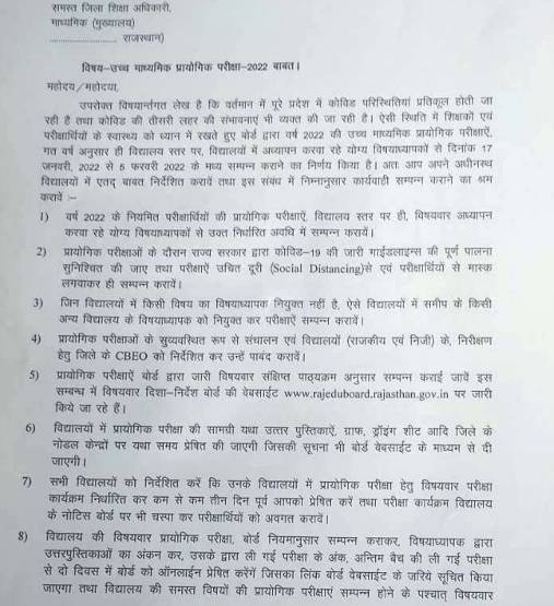 RBSE has announced the exam dates for practicals. The RBSE Class 12 practical exam 2022 will be held from January 17 to February 5, 2022.