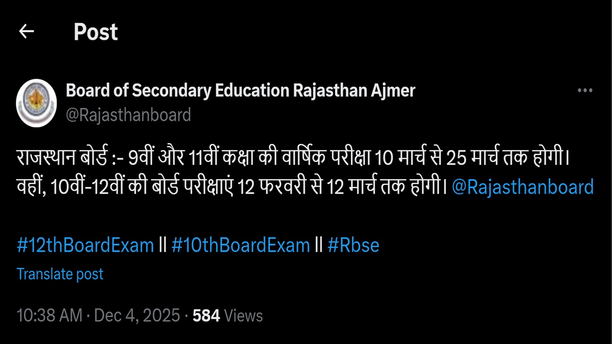 According to the Rajasthan Board timetable 2026, RBSE 10th Board Exam 2026 will be held from March 10 to March 25, 2026 in a single shift. Similarly, RBSE Class 12th Board Exam 2026 will start from February 12 and the last exam will be on March 12.
