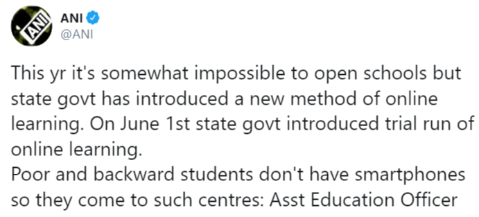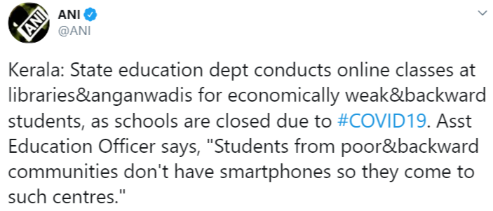 An official tweet published by a reputed source states, “Kerala: State education dept conducts online classes at libraries&anganwadis for economically weak&backward students, as schools are closed due to #COVID19. Asst Education Officer says, "Students from poor&backward communities don't have smartphones so they come to such centres.”