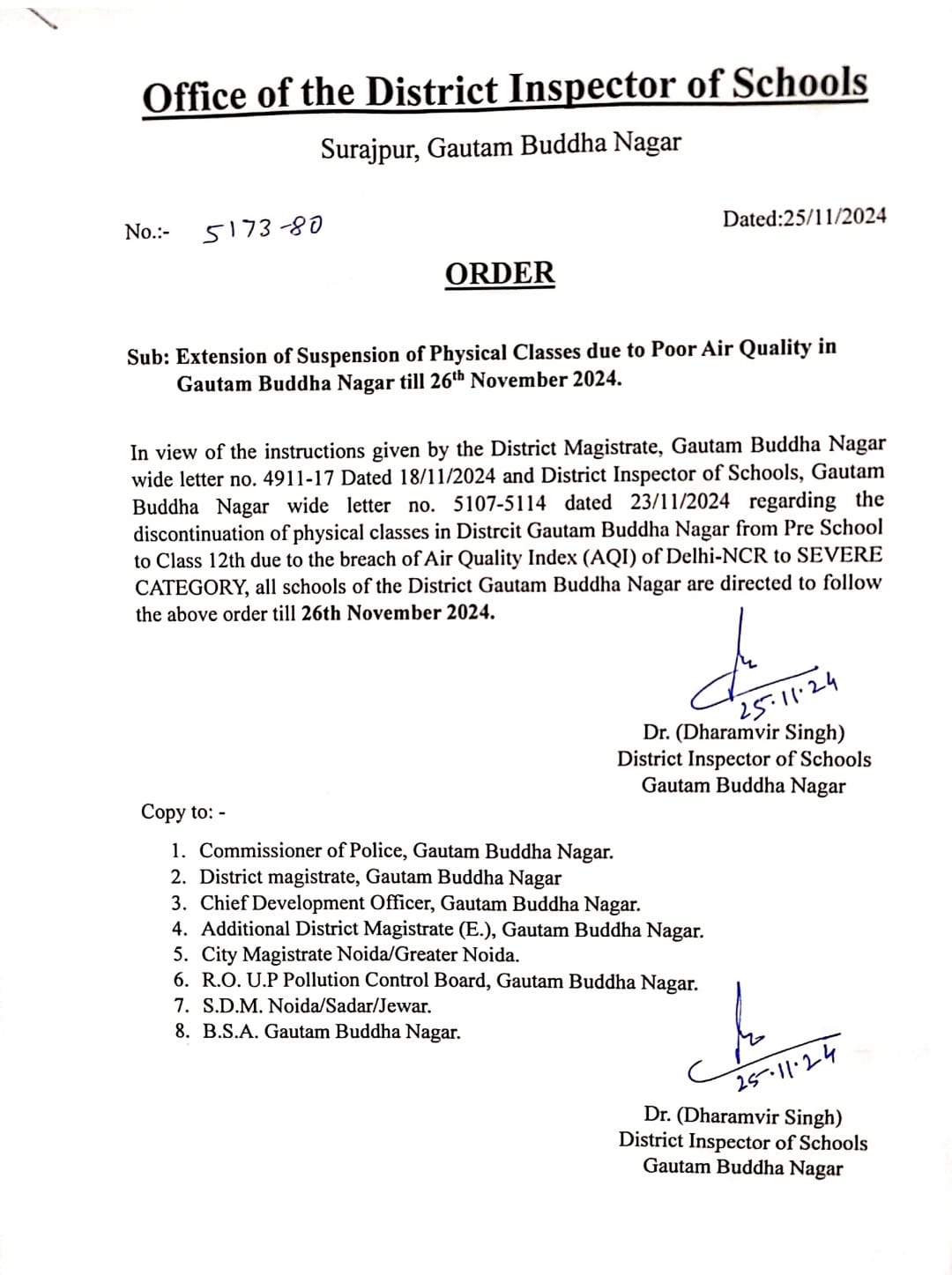 The notice reads: “In view of the instructions given by the District Magistrate, Gautam Buddha Nagar wide letter no. 4911-17 Dated 18/11/2024 and District Inspector of Schools, Gautam Buddha Nagar wide letter no. 5107-5114 dated 23/11/2024 regarding the discontinuation of physical classes in Distrcit Gautam Buddha Nagar from Pre School to Class 12th due to the breach of Air Quality Index (AQI) of Delhi-NCR to SEVERE CATEGORY, all schools of the District Gautam Buddha Nagar are directed to follow the above order till 26th November 2024.”