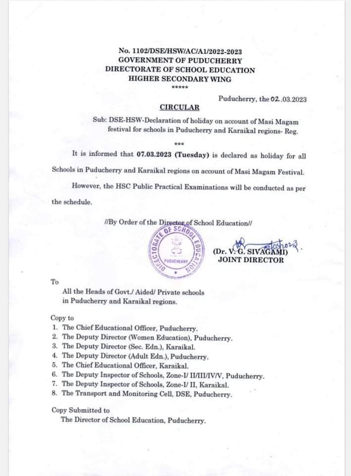 The official notification issued by the Puducherry government reads, "It is informed that 07.03.2023 (Tuesday) is declared as holiday for all Schools in Puducherry and Karaikal regions on account of Masi Magam Festival. However, the HSC Public Practical Examinations will be conducted as per the schedule."