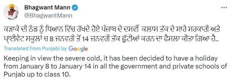 Punjab CM in his post said, “In view of the inclement weather conditions in the region, Punjab Chief Minister Bhagwant Singh Mann has ordered that all the government, government-aided and private schools in the state up to Class 10 will remain closed from January 8-14.”