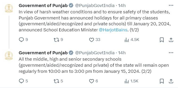 Punjab Schools Closed! The government of Punjab has announced the closure of schools for students up to Class 5. Punjab School Winter Vacation 2024 has been extended for students up to Class 5 at all schools until January 21. The decision is taken in the wake of severe cold conditions prevailing across the state. Making the announcement on X, Education Minister Harjot Singh Bains said In view of harsh weather conditions and to ensure the safety of the students, the Punjab Government has announced holidays for all primary classes (government/aided/recognized and private schools) till January 20, 2024.