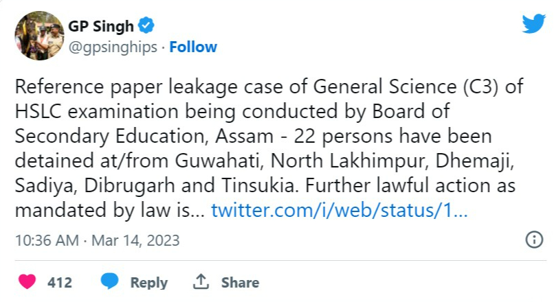 Assam Director General of Police Gyanendra Pratap Singh informed the media that a total of 22 people have been detained from Guwahati, Dhemaji, Sadiya, North Lakhimpur, Dibrugarh and Tinsukia. "Further lawful action as mandated by law is being taken against them. We remain committed to unearthing the network of people involved in leakage of the question paper and the conspirators," he tweeted.