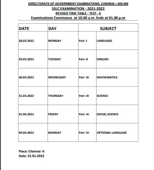 Tamil Nadu board second round revision test will begin from March 28 for both SSLC and 12th classes. According to the released time table, the second round of revision tests will begin with the language paper. Revision tests for SSLC will be conducted from 10 am to 2 pm while class 12th students will participate in the test from 2 pm to 5 pm. 2nd round of revision tests for class 10 will conclude on April 4 while the revision tests for class 12 students will end on April 5, 2022. Check the Tamil Nadu second round revision test time table for 10 and 12 classes below.