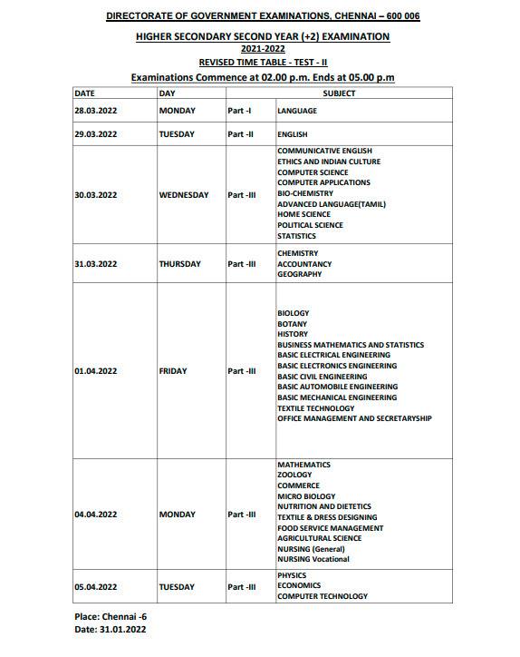 Tamil Nadu Board 2nd Round Revision Test Time Table 2022 for Class 12