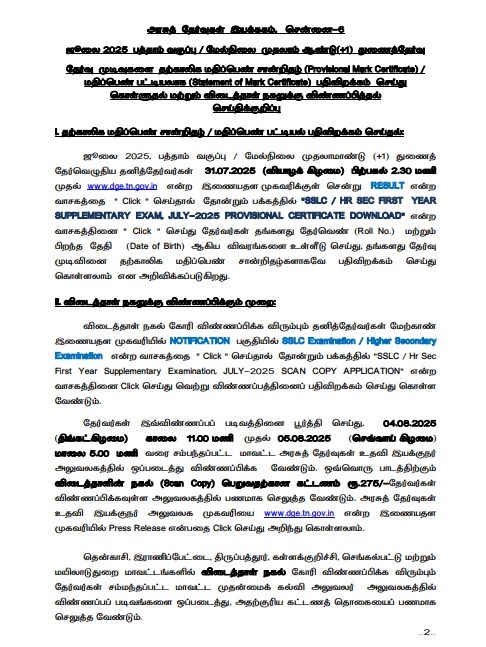 TN SSLC supplementary result 2025 tomorrow! The Directorate of Government Examination (DGE) TN will release Tamil Nadu 10th supplementary result 2025 tomorrow July 31, 2025 at 2.30 pm. Students can check the official website - dge.tn.gov.in or tnresults.nic.in. for the Tamil Nadu SSLC supplementary result 2025. They have to enter roll number and date of birth to download Tamil Nadu SSLC supplementary Result 2025. The TN Plus one supplementary result 2025 will also be released tomorrow, along with TN SSLC supply result 2025. Students can apply for copy of answer sheet from August 4 to 5, 2025.