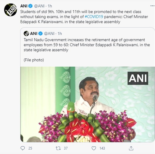 Tamil Nadu government has decided to promote all students of TN SSLC, 9th and 11th to the next class without any examinations. This move comes in the wake of the COVID19 pandemic, announced Tamil Nadu Chief Minister Edappadi K Palaniswami.