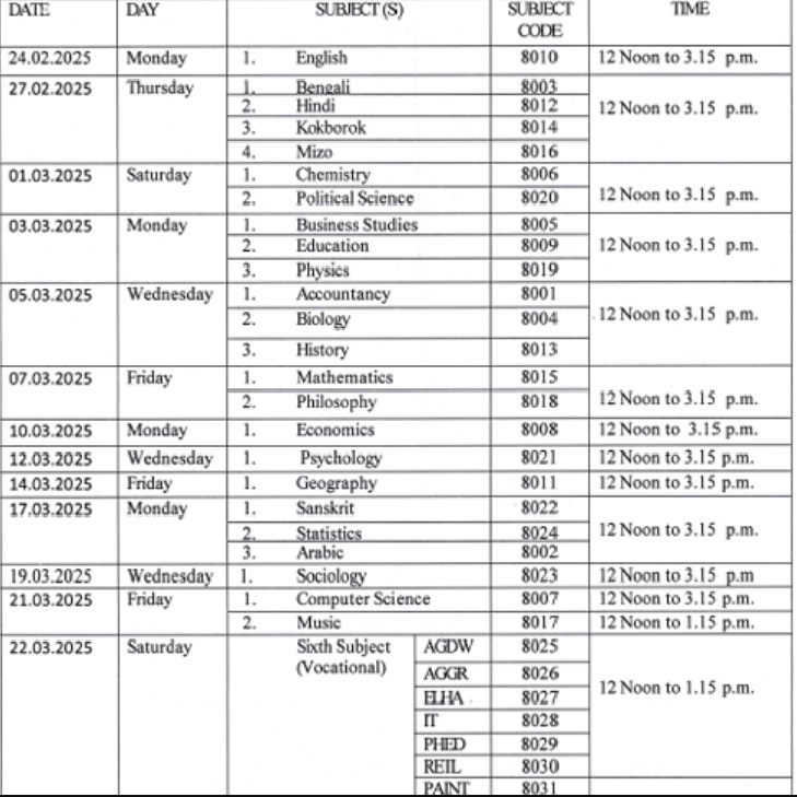 The Tripura Board of Secondary Education (TBSE) released the date sheet for the Class 10 and Class 12 board exams. According to the TBSE schedule, the TBSE HS exams will be held between February 24 and March 22 while TBSE Madhyamik exams will be held between Feb 25 and March 18, 2025