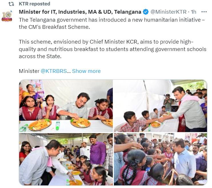 Telangana government has launched the "Chief Minister's Breakfast Scheme" for school children. After the launch of the scheme, Minister for IT and Industries Rama Rao said the scheme will be implemented throughout 27,147 government schools across the state.