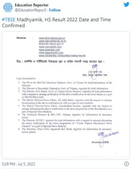 TBSE Madhyamik, 12th result 2022 to be released in another hour