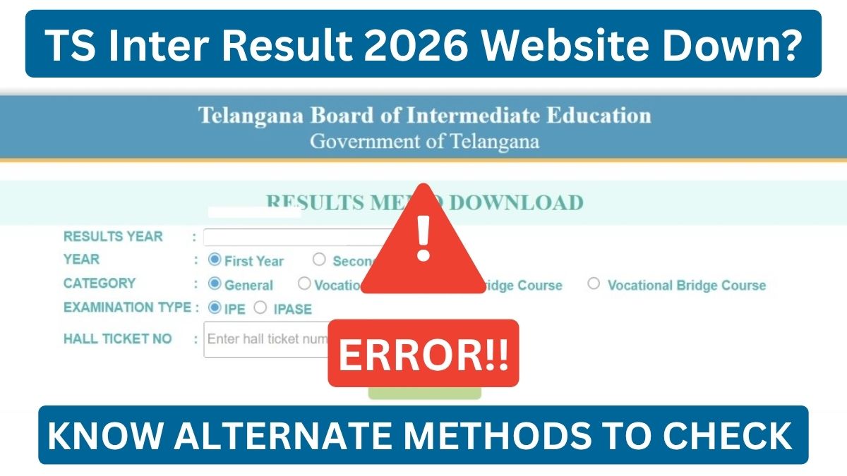 TS Inter Result 2026 Website Error: Telangana State Board of Intermediate Education (TSBIE) result website is down. Like every year, several students are facing errors while opening the TSBIE Telangana inter result 2026 website. The official website of TSBIE has already started crashing amid result announcement.Β During this time, official websites often get slow due to heavy traffic load. A large number of users try to log in at the same time, which has caused TS Inter second year result 2026 website to slow down or crash temporarily. In case a student is unable to check result or download mark memo, they can understand other ways to check TS Inter class 12 result 2026.