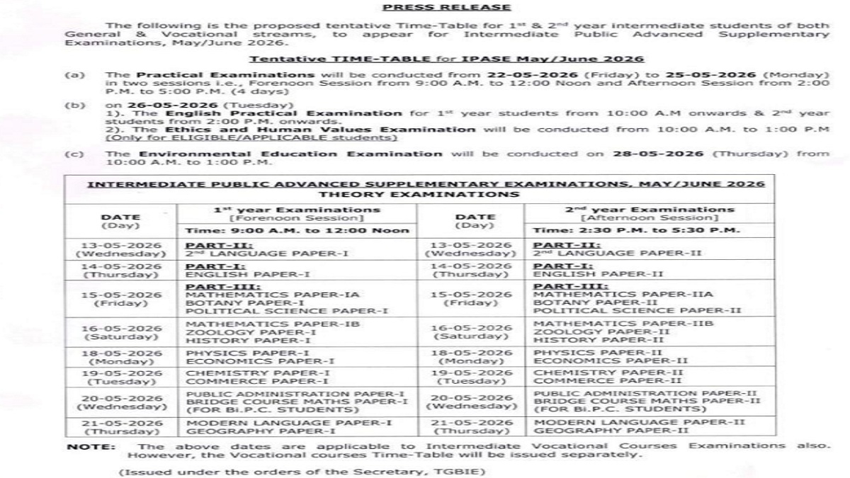 Whereas, TS Inter supplementary practical exam 2026 will be held from May 22 in two shifts. TS inter morning session will be held for 1st year and evening shift for 2nd year students. Earlier, TS inter 2026 results werre announced. Students who appeared in inter 1st and 2nd year board examinations can check their Telangana Inter result at tgbie.cgg.gov.in.