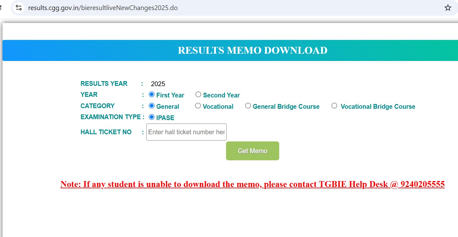 Step 3: In the input fields, select the year, exam name, and category, and enter your TS Inter hall ticket number 2025.