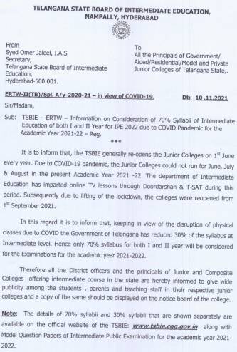 According to Secretary, TSBIE, Syed Omer Jaleel, the details of the 70 per cent syllabus that will be included in the examinations and the 30 per cent reduced syllabus will be displayed separately for the benefit of students on the TSBIE official website, along with model question papers of Intermediate Public Examinations for the academic year 2021-22.