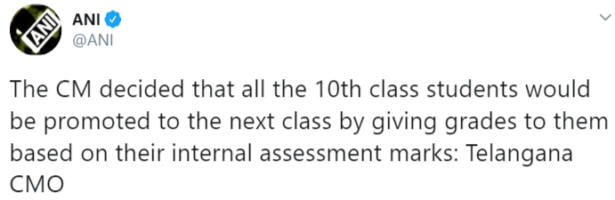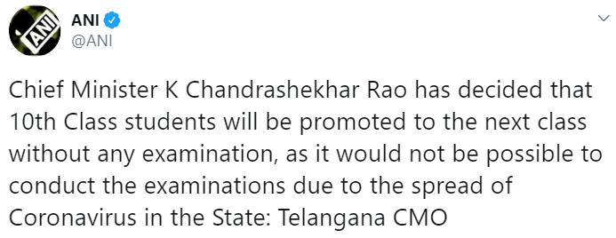 The reports also suggest that the TS SSC Results 2020 will be released by giving TS Class 10th students who appeared for the TS SSC Board Exams 2020 grades based on their internal assessment marks. An official tweet by ANI states, “The CM decided that all the 10th class students would be promoted to the next class by giving grades to them based on their internal assessment marks”