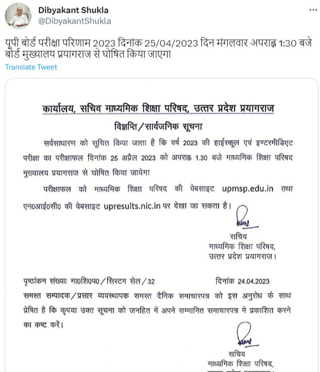 UPMSP secretary Dibyakant Shukla announced today that the UP Board Class 10, 12 results 2023 will be declared tomorrow, i.e. on April 25 at 1:30 PM. Official notification for the same can be checked below: