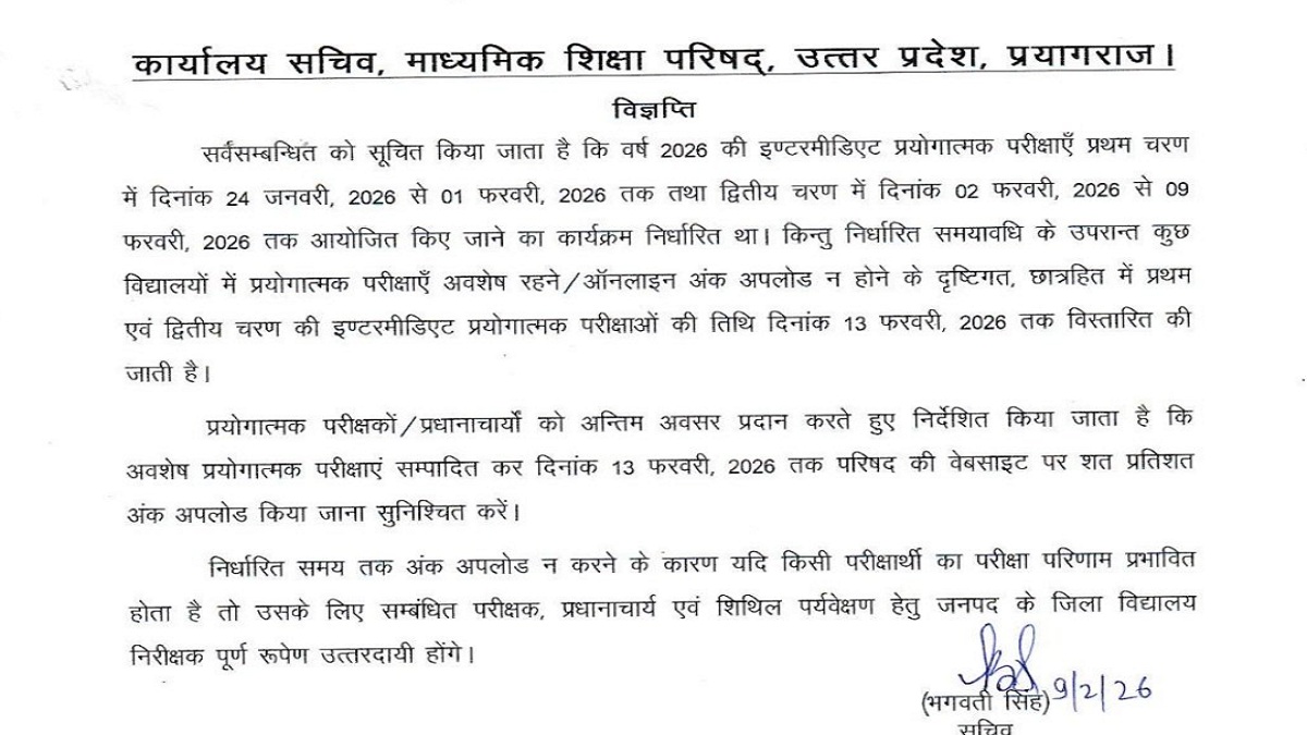UP Board Practical Exam 2026: Uttar Pradesh Madhyamik Shiksha Parishad has extended dates for UP Board Intermediate practical exams 2026. Considering pending UPMSP 12th practical exam and delay in online marks submission, UP Board has decided to extend both phases of class 12th practical exams till February 13, 2026. The decision has been taken to avoid inconvenience to students and ensure fair evaluation.