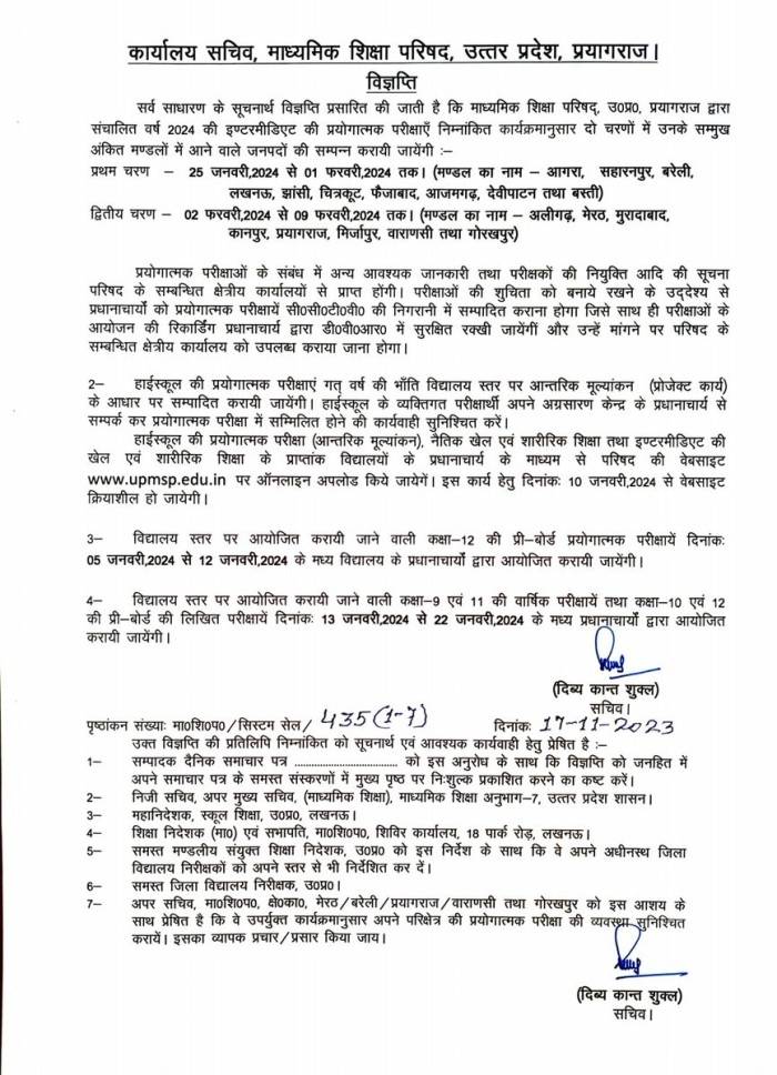 Uttar Pradesh Madhyamik Shiksha Parishad (UPMSP) announced the UP Board Class 12 practical exam dates. UP Board will also hold class 10 and 12 pre-board written exams between January 13 and 22.