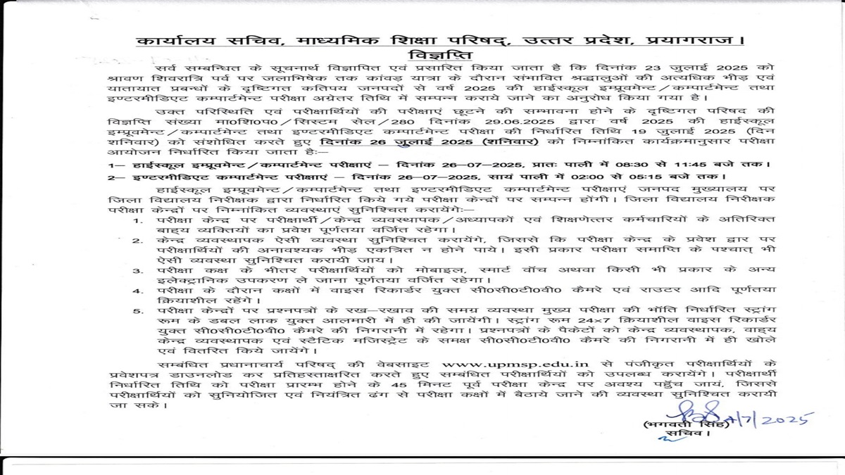 The Uttar Pradesh Madhyamik Shiksha Parishad (UPMSP) has rescheduled the UP Board class 10 and 12 compartment/improvement exams 2025 from July 19 to July 26, 2025 (Saturday) due to the heavy crowd expected during the Shravan Shivratri Kanwar Yatra. Read on to know the detail.