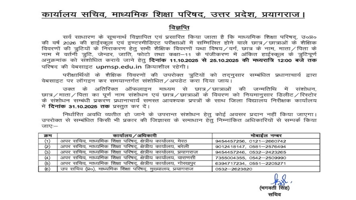 Uttar Pradesh Madhyamik Shiksha Parishad has announced that online portal for correcting errors in educational details of students appearing in the UP Board 10th, 12th, 2026 exam will be active from October 11, 2025. The last date for rectification in UP Board exam form 2026 is October 25, 2025 (till midnight). The UPMSP correction link will be available at official UP Board website upmsp.edu.in.