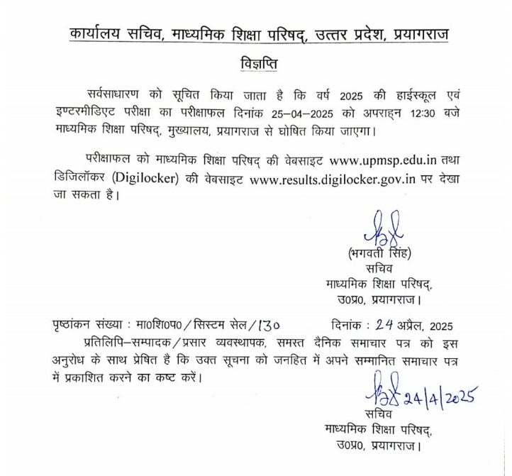 उत्तर प्रदेश माध्यमिक शिक्षा परिषद ने आज 25 अप्रैल, दोपहर 12:30 बजे UP Board Result 2025 और UP Board Result 2025 दोनों एक साथ जारी करने की घोषणा की है।