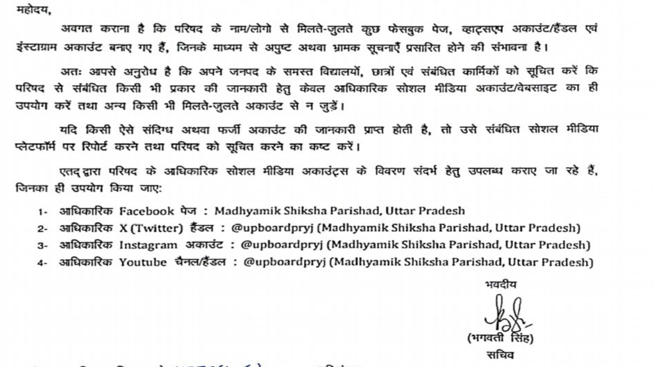 Uttar Pradesh Madhyamik Shiksha Parishad (UPMSP) has relesed a notification regarding Fake Social Media Accounts, websites, accounts, and Instagram accounts resembling UP board. Circular says " It has come to notice that some fake pages, websites, accounts, and Instagram accounts resembling those of Board have been created, through which misleading or incorrect information is being spread. Therefore, you are requested to inform all schools, students, and concerned staff in your district that for any information related to Board, only Board’s official social media accounts/websites should be used, and no information should be obtained from or shared through any similar-looking fake accounts. If information is received from any suspicious or fake account, it should be reported on concerned social media platform and Board should also be informed immediately."